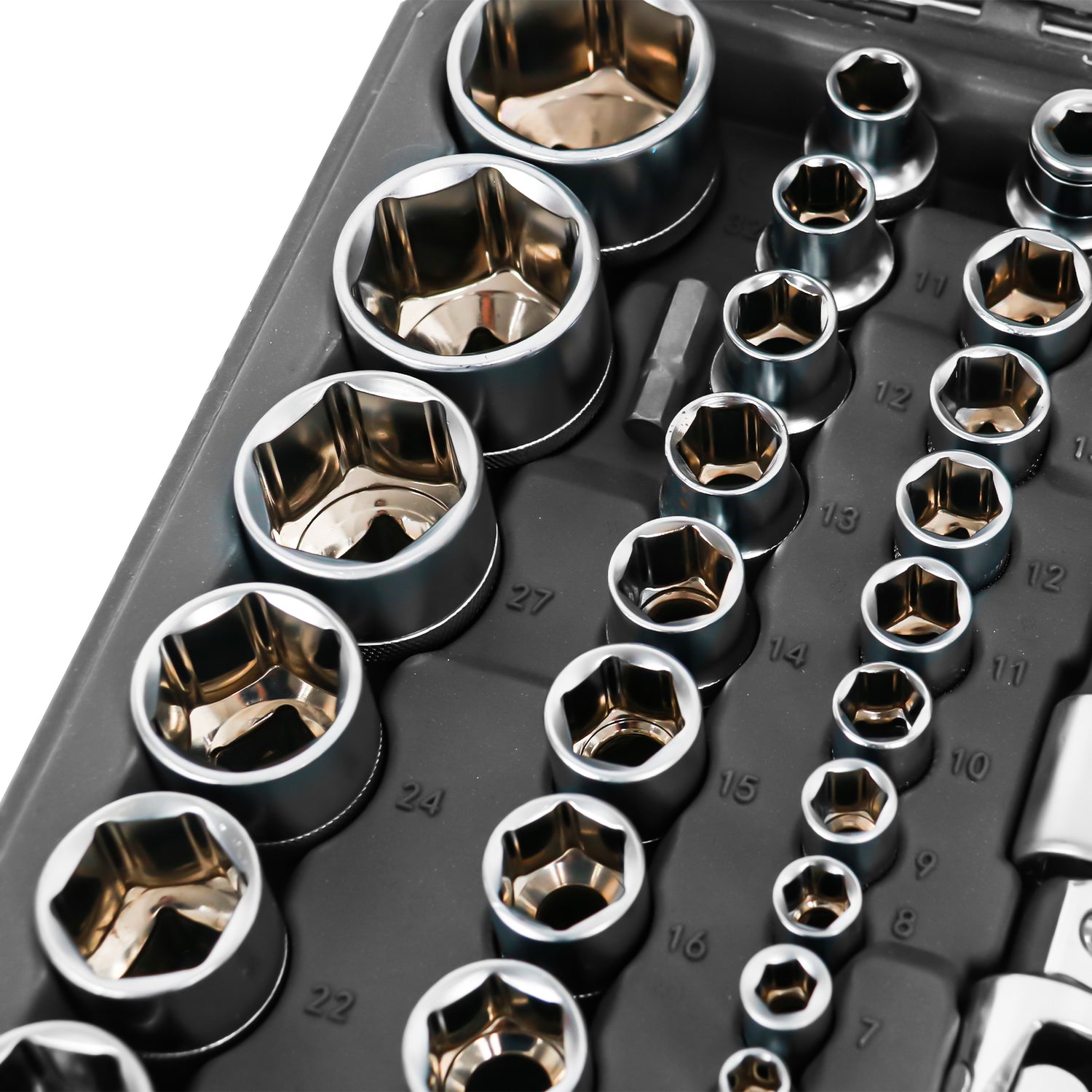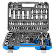 • Incluye: Llaves de carraca rápida, extensiones 2"-10", articulaciones cardánicas, llaves de vaso estándar (4-32 mm), llaves E-TX (E4-E24), llaves para bujías (16 y 21 mm), destornilladores hexagonales, 17 puntas de destornillado variadas, portapuntas