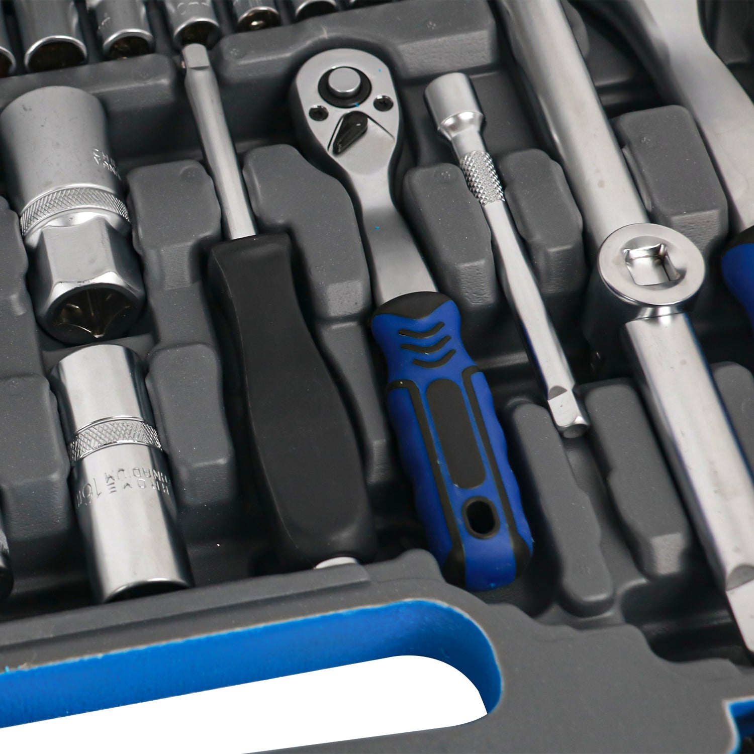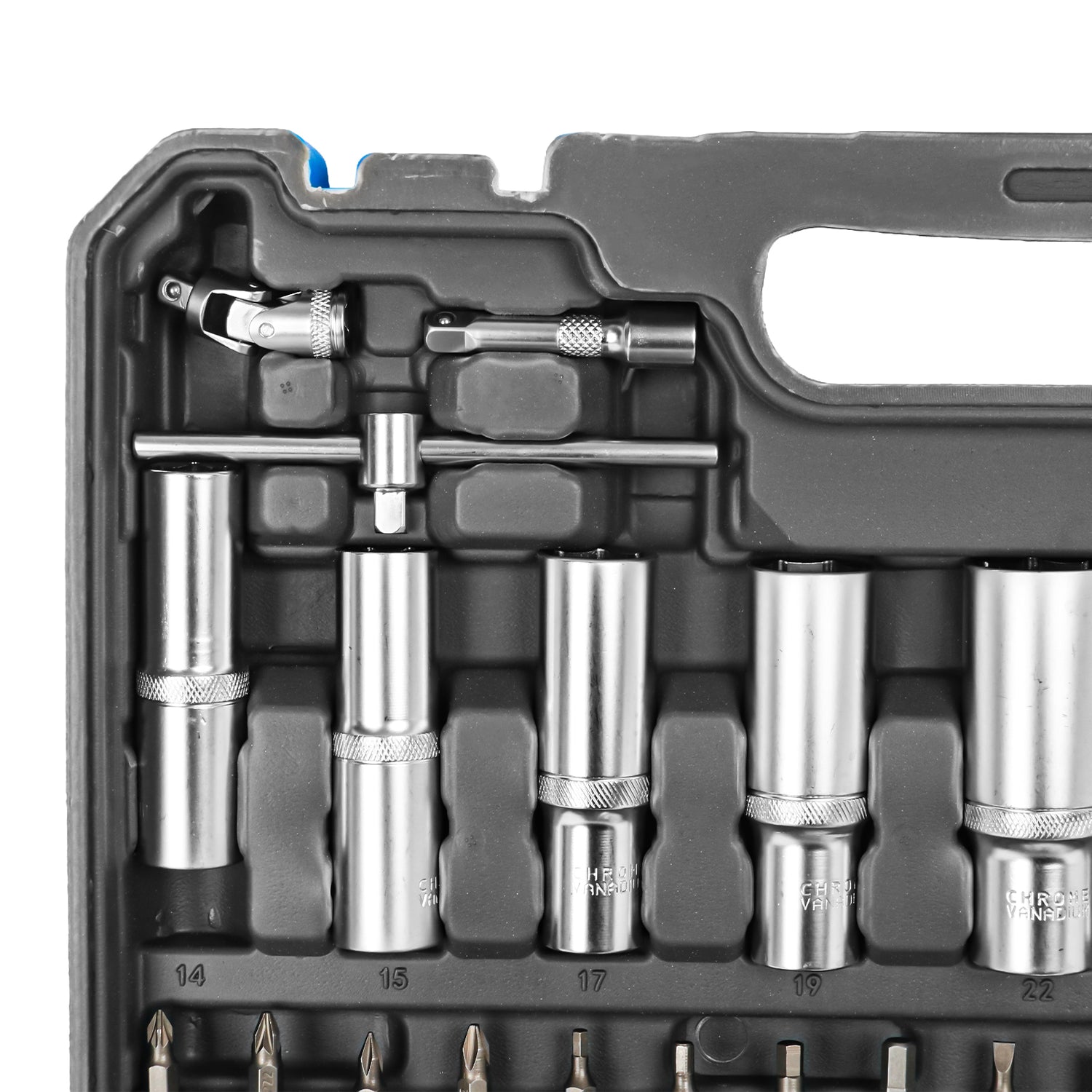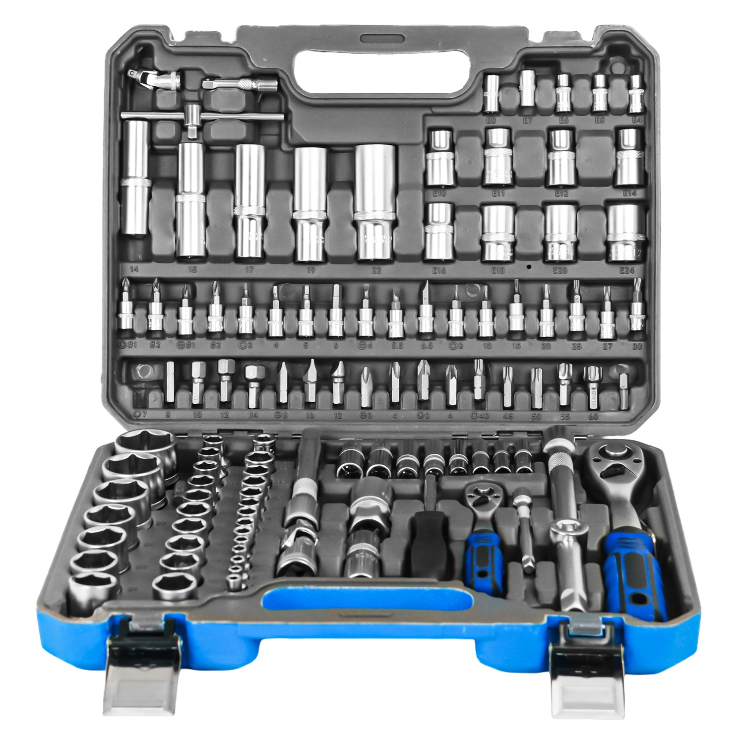 ¿Lo mejor? Todo viene perfectamente organizado en compartimentos moldeados dentro de un maletín de transporte resistente con cierres metálicos de seguridad. Cada pieza tiene su lugar específico, así que sabes al instante si falta algo. El maletín azul brillante es fácil de identificar en cualquier taller, y el asa ergonómica hace que llevarlo sea cómodo.