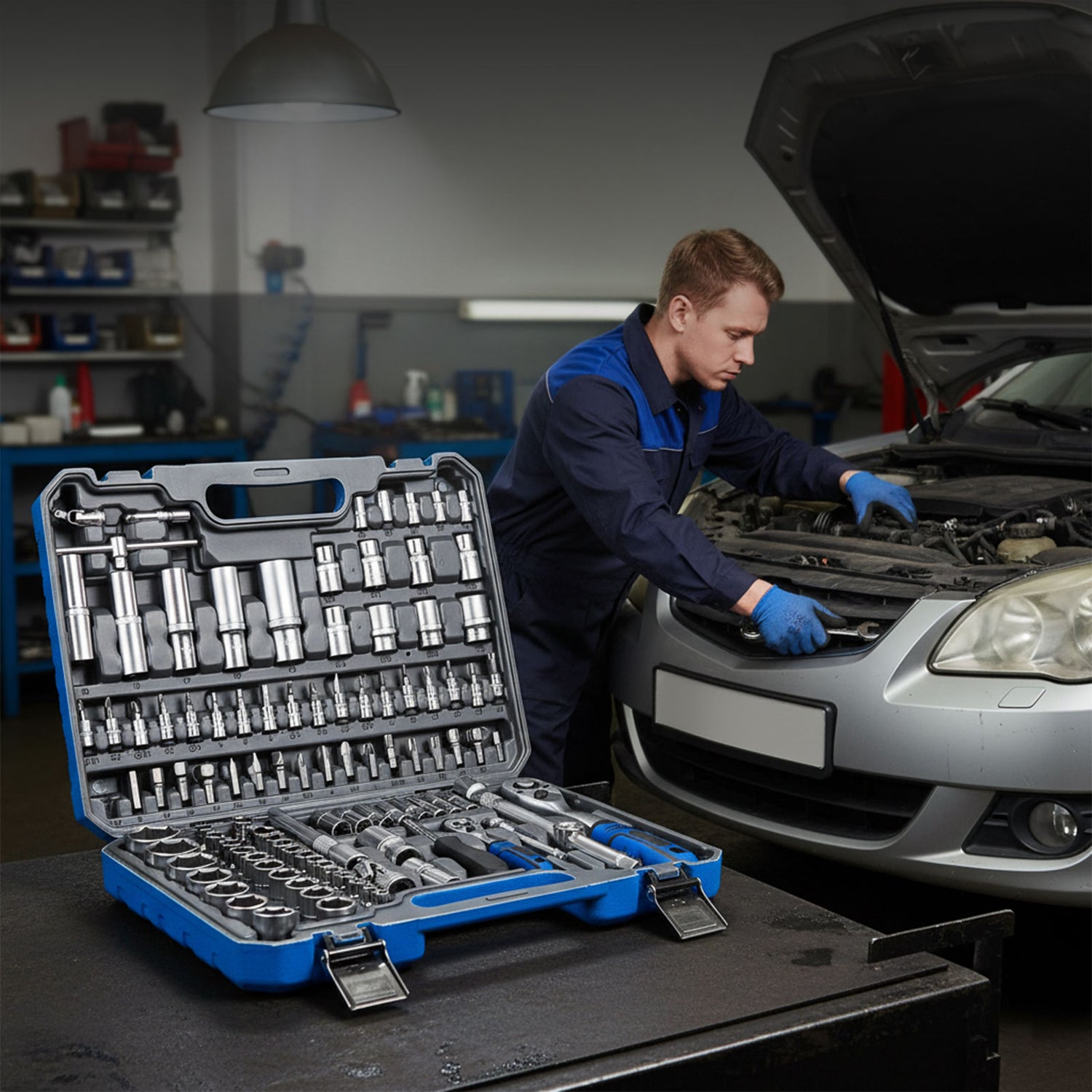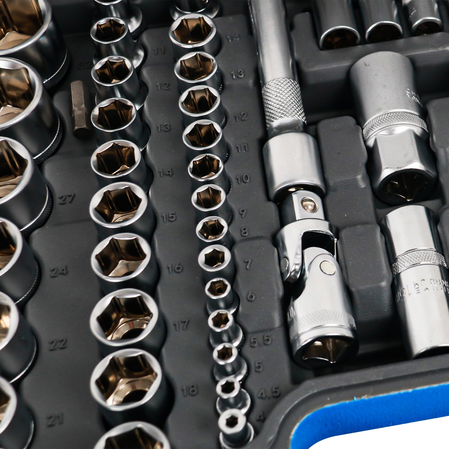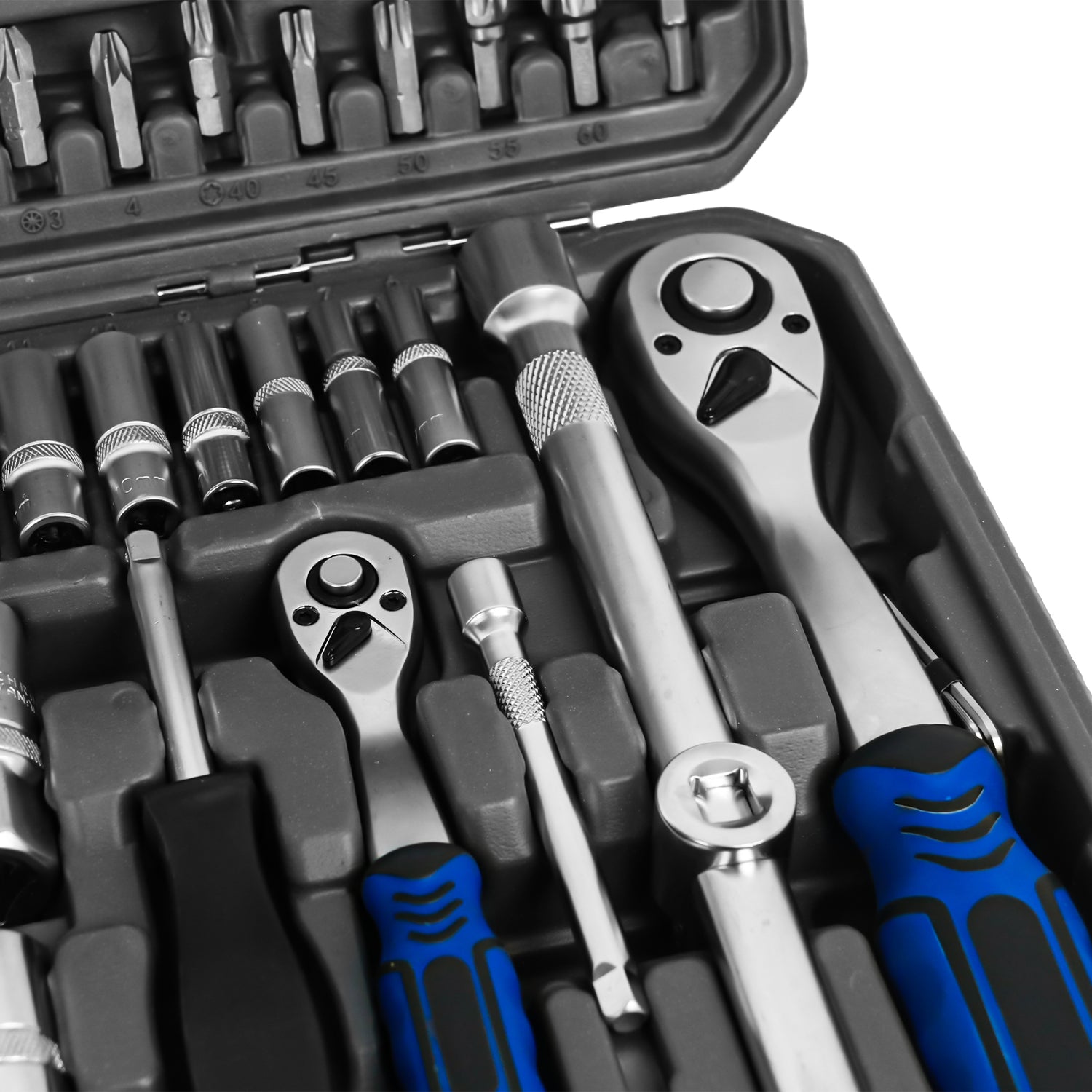 ¿Lo mejor? Todo viene perfectamente organizado en compartimentos moldeados dentro de un maletín de transporte resistente con cierres metálicos de seguridad. Cada pieza tiene su lugar específico, así que sabes al instante si falta algo. El maletín azul brillante es fácil de identificar en cualquier taller, y el asa ergonómica hace que llevarlo sea cómodo.