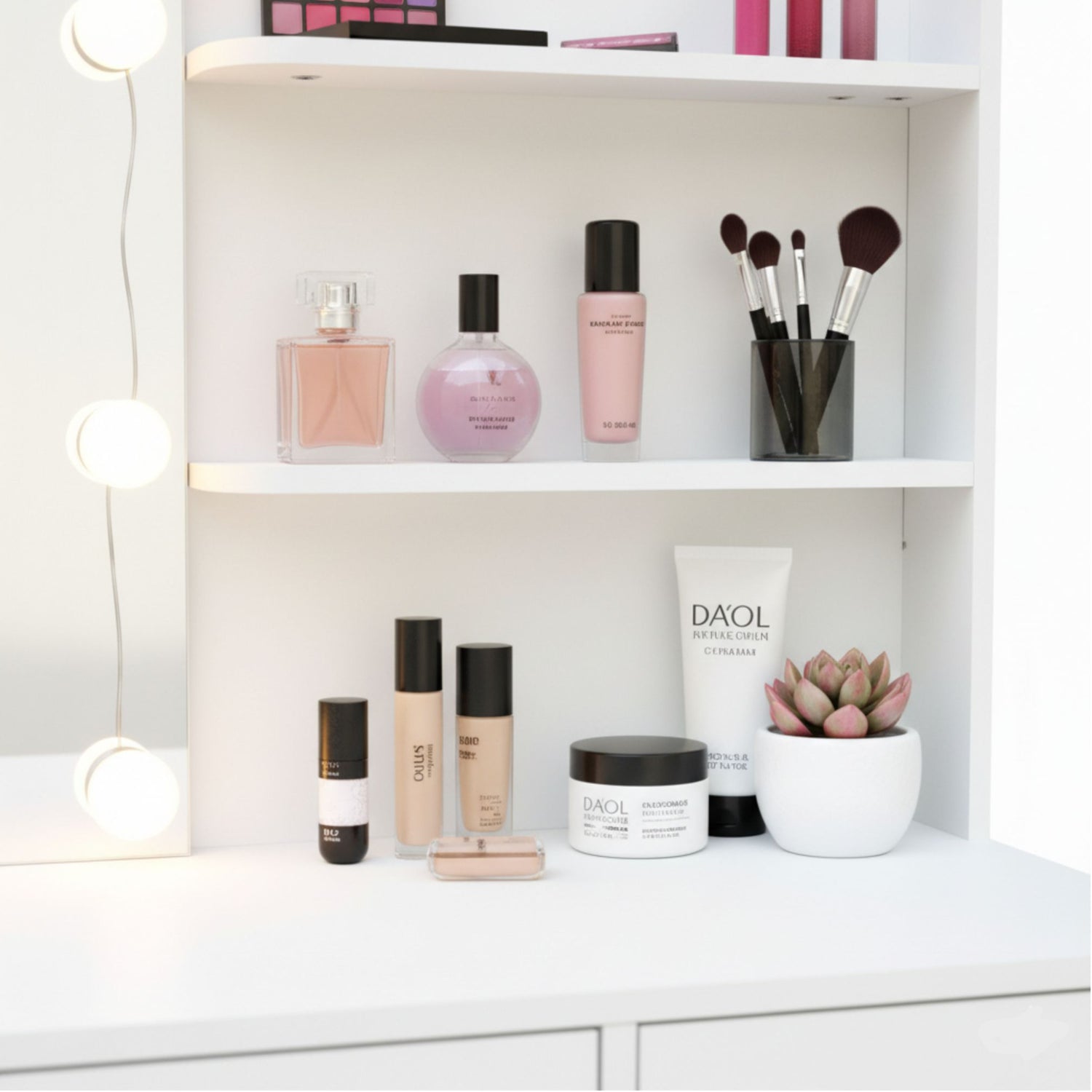 Cuenta con estantes abiertos laterales, perfectos para organizar maquillaje, perfumes o esmaltes. El cajón grande central es ideal para brochas, lápices o joyas, mientras que el armario con dos alturas ofrece un extra de almacenaje para productos más grandes o de uso ocasional.