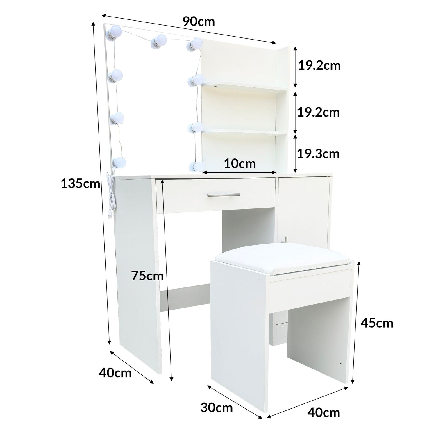La encimera, de 90 cm de ancho, ofrece espacio suficiente para colocar tus cosméticos o incluso usarlo como escritorio en momentos puntuales. Todo fabricado en tablero de partículas con acabado blanco mate que combina con cualquier estilo decorativo. Incluye un taburete acolchado, cómodo y compacto. Es un producto fácil de montar, con instrucciones claras paso a paso.