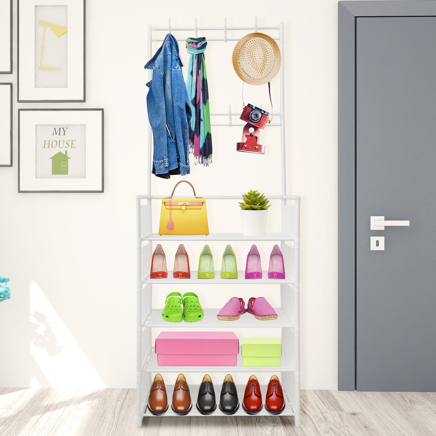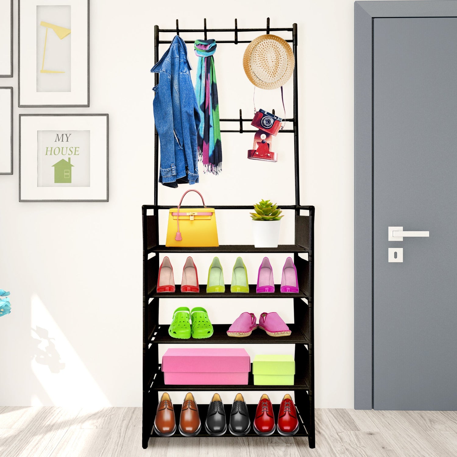 5 baldas individuales con protectores laterales anti-caidas para almacenar los artículos de uso diario, bolsos, zapatos y todos los objetos que utilizas para salir de casa.