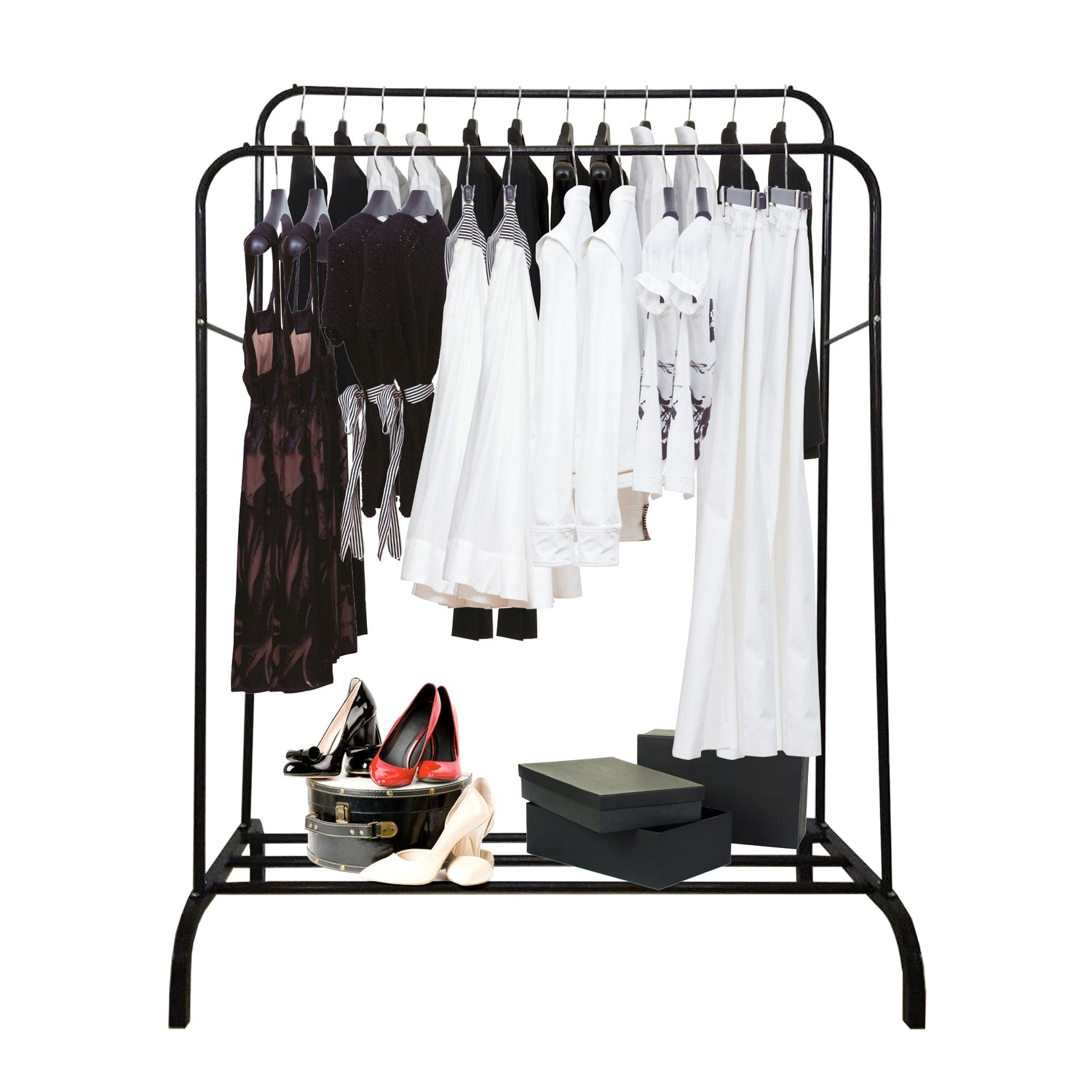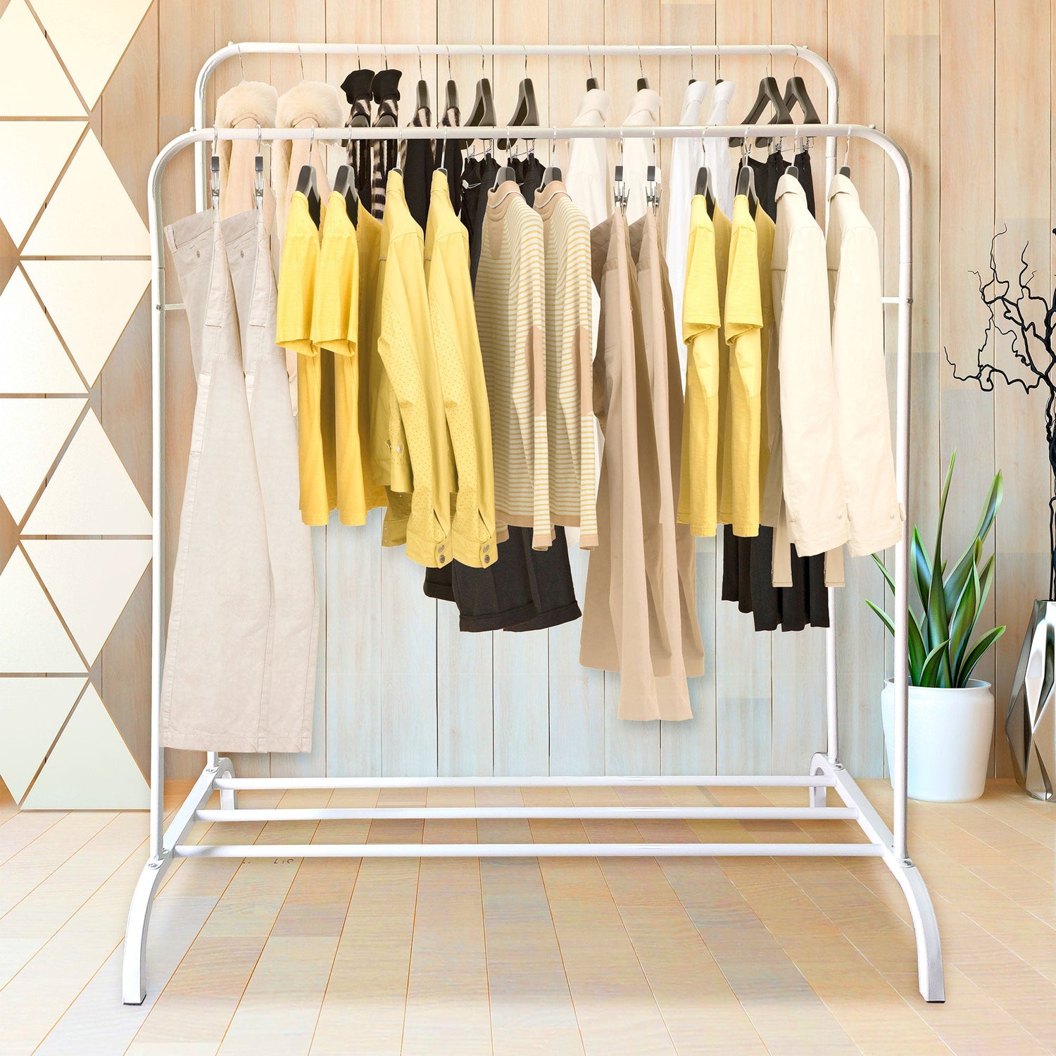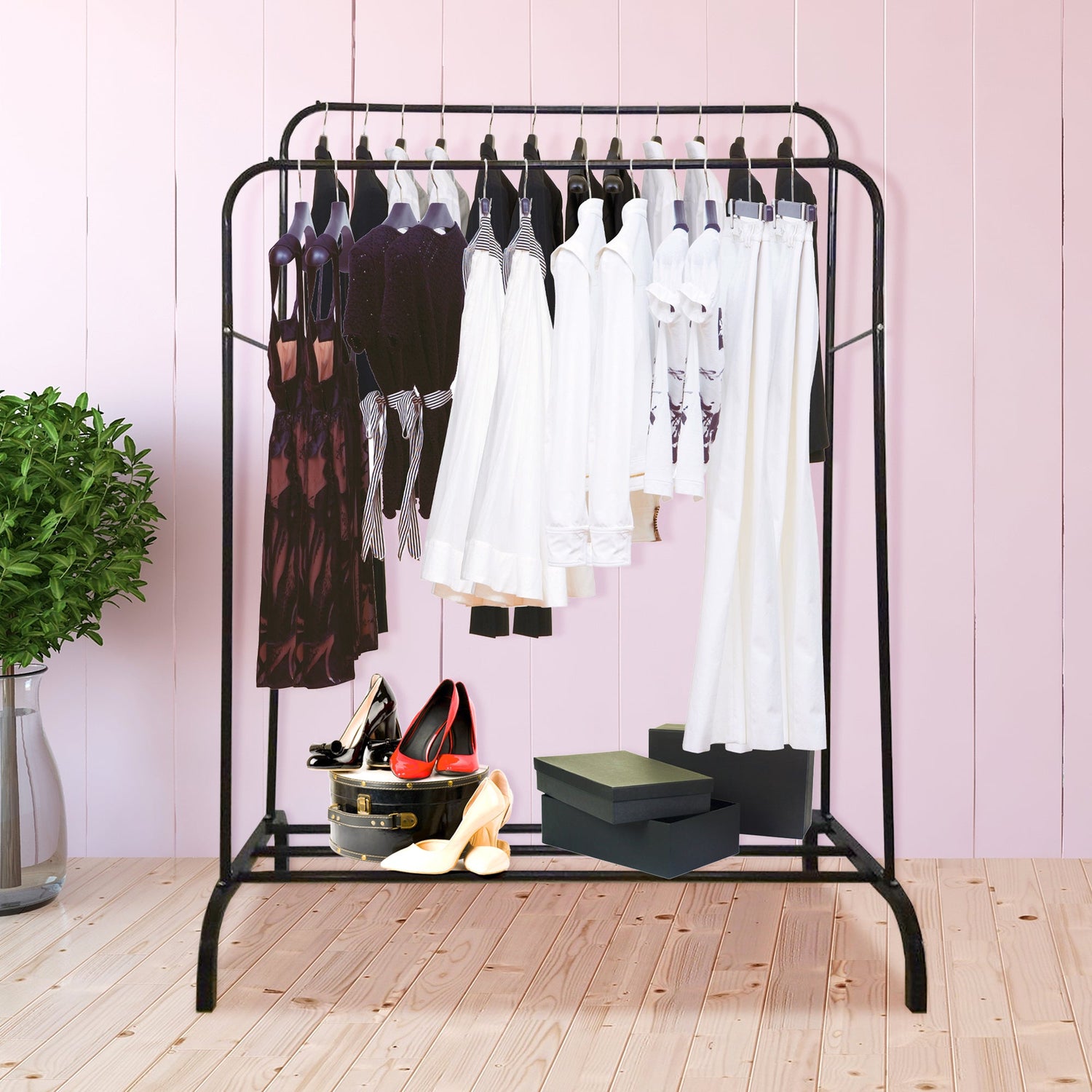Perchero de dimensiones amplias y generosas para guardar tus prendas, el riel superior ofrece suficiente espacio para ropa, bolsos, blusas.